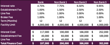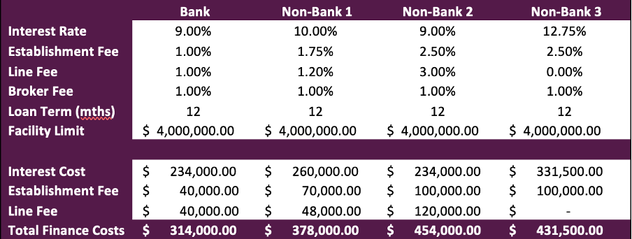 Across the board, there is a material reduction in the cost of finance from all lenders, falling as far as 37% from just 12 months ago. Based on a $4M limit with a 12 month term, this is providing savings of $68,000-$117,000, which can make a material difference to the overall feasibility of a development.